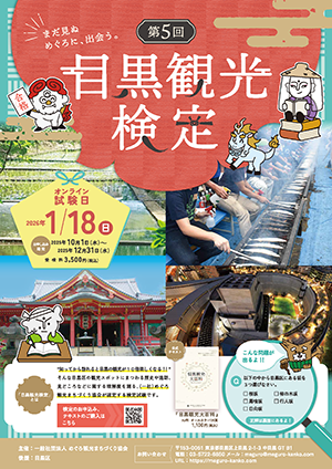 - ”知ってから行くとめぐろ観光が10倍楽しくなる!!" そんな目黒区の観光スポットにまつわる歴史や逸話、見どころなどに関する理解度を測る、めぐろ観光まちづくり協会が認定する検定試験です。