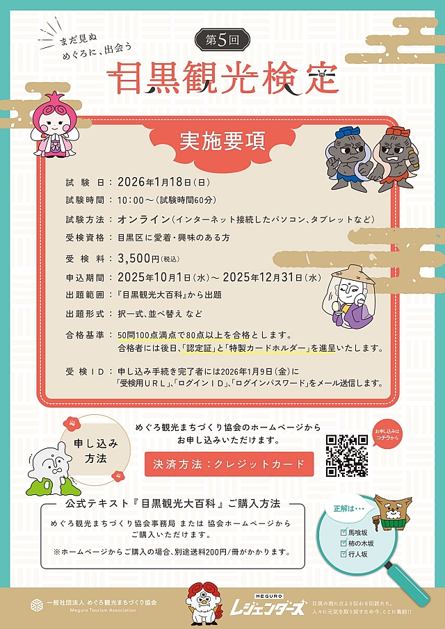 そんな目黒区の観光スポットにまつわる歴史や逸話、見どころなどに関する理解度を測る、めぐろ観光まちづくり協会が認定する検定試験です。